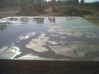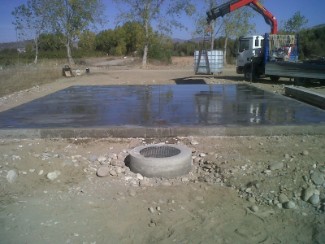 S'ha realitzat una neteja, esbrossada i excavació en el terreny. A continuació s'ha fet un rebaix de la caixa de paviment i s'ha procedit a la construcció d'una solera de 10*8'5m i 20 cm de gruix de formigó amb malla electrosoldada 15/15/6. L'acabat ha estat fratassat semi - fi. Seguidament s'ha realitzat la construcció d'un pou circular estanc de 3'5m de profunditat i de 1`2 m de diàmetre amb tapa de fundició de 0'6m de diàmetre per a recollir els lixiviats resultants del procés de compostació.